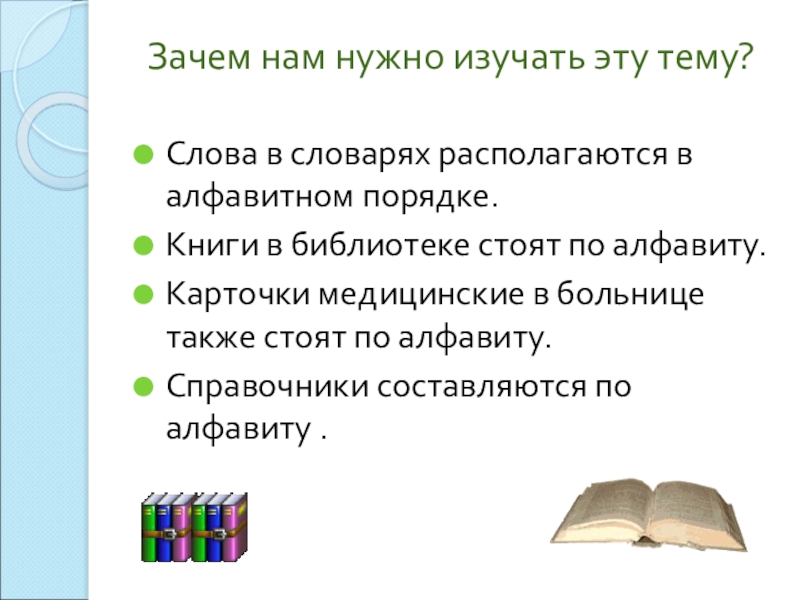 Зачем нам нужно изучать эту тему? Слова в словарях располагаются в алфавитном порядке.Книги в библиотеке стоят