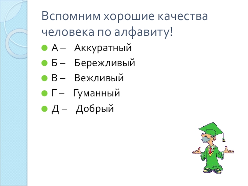 Вспомним хорошие качества человека по алфавиту!А –  Аккуратный Б –  БережливыйВ –  ВежливыйГ –