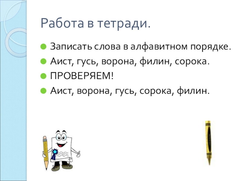 Работа в тетради.Записать слова в алфавитном порядке.Аист, гусь, ворона, филин, сорока.ПРОВЕРЯЕМ!Аист, ворона, гусь, сорока, филин.