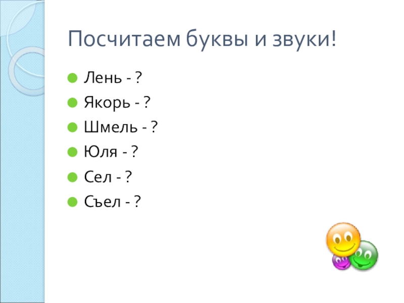 Посчитаем буквы и звуки!Лень - ?Якорь - ?Шмель - ?Юля - ?Сел - ?Съел - ?