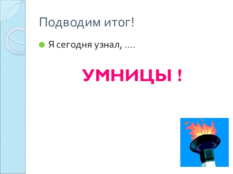 Подводим итог!Я сегодня узнал, ….УМНИЦЫ !