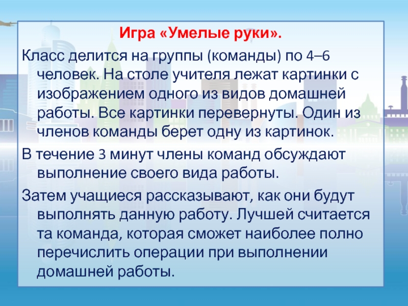 Игра «Умелые руки».Класс делится на группы (команды) по 4–6 человек. На столе учителя лежат картинки с изображением