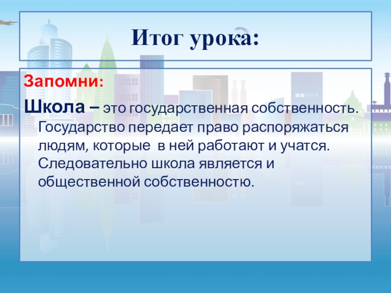 Итог урока:Запомни:Школа – это государственная собственность. Государство передает право распоряжаться людям, которые в ней работают и учатся.