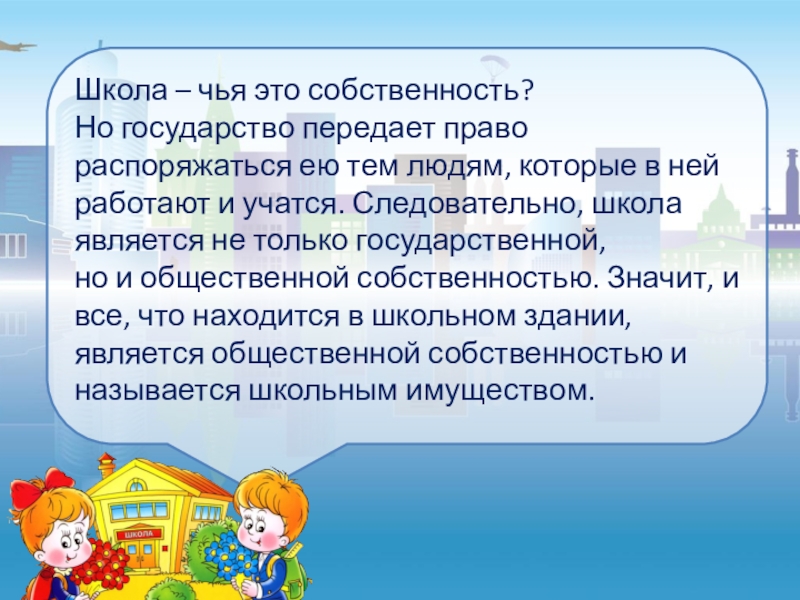 но и общественной собственностью. Значит, и все, что находится в школьном здании, является общественной собственностью и называется школьным имуществом.