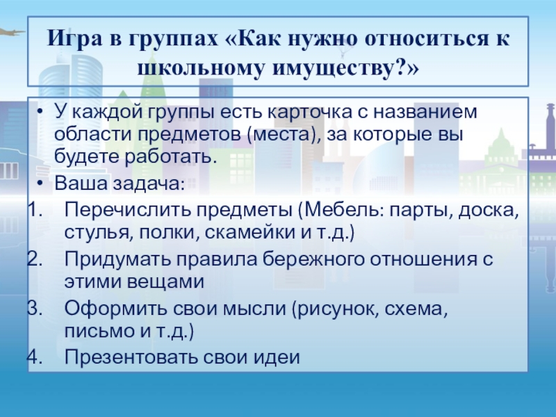 Слайд 7Игра в группах «Как нужно относиться к школьному имуществу?»