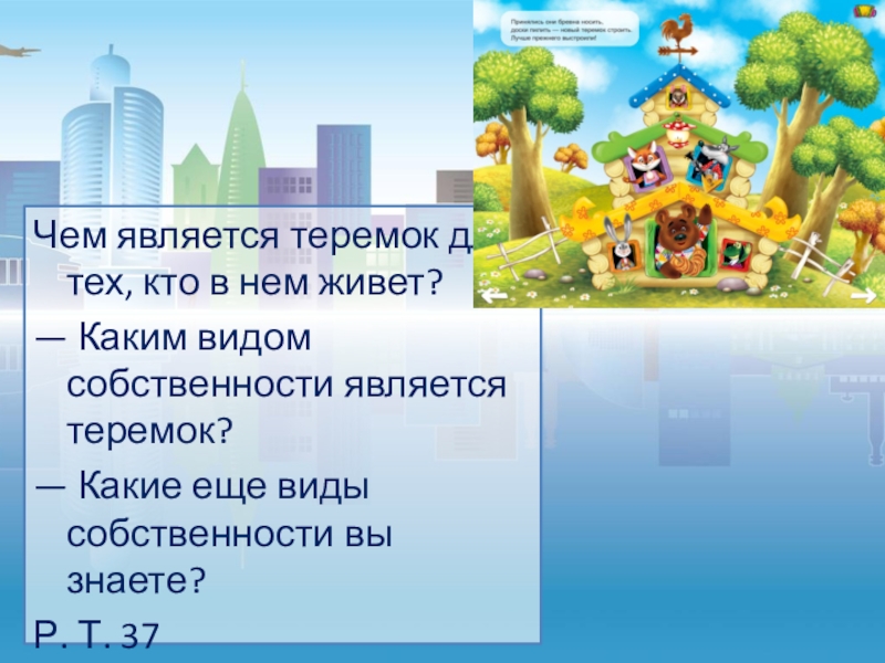 Чем является теремок для тех, кто в нем живет?— Каким видом собственности является теремок?— Какие еще виды собственности вы знаете?Р. Т. 37