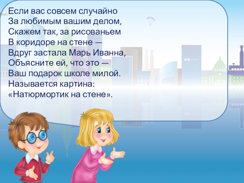 Если вас совсем случайноЗа любимым вашим делом,Скажем так, за рисованьемВ коридоре на стене —Вдруг застала Марь Иванна,Объясните ей, что это —Ваш подарок школе милой.Называется картина:«Натюрмортик на стене».