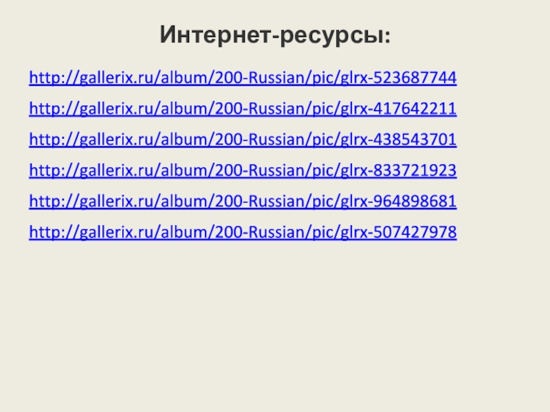 Интернет-ресурсы:http://gallerix.ru/album/200-Russian/pic/glrx-523687744http://gallerix.ru/album/200-Russian/pic/glrx-417642211http://gallerix.ru/album/200-Russian/pic/glrx-438543701http://gallerix.ru/album/200-Russian/pic/glrx-833721923http://gallerix.ru/album/200-Russian/pic/glrx-964898681http://gallerix.ru/album/200-Russian/pic/glrx-507427978