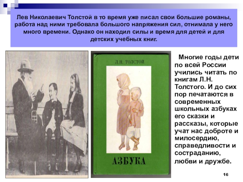 Многие годы дети по всей России учились читать по книгам Л.Н.Толстого. И до сих пор печатаются в современных школьных азбуках его сказки и рассказы, которые учат нас доброте и милосердию, справедливости и состраданию, любви и дружбе.