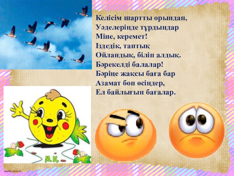 Келісім шартты орындап, Уәделеріңде тұрдыңдарМіне, керемет!Іздедік, таптықОйландық, біліп алдық.Бәрекелді балалар!Бәріңе жақсы баға барАзамат боп өсіңдер,Ел байлығын бағалар.