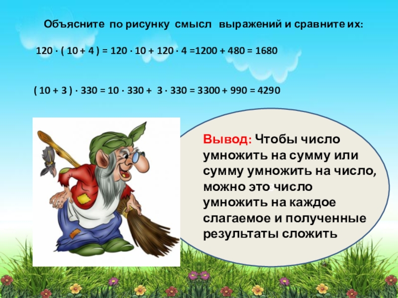 Вывод: Чтобы число умножить на сумму или сумму умножить на число, можно это число умножить на каждое слагаемое и полученные результаты сложить