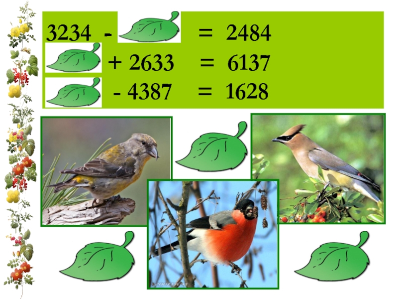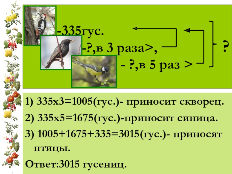 3) 1005+1675+335=3015(гус.)- приносят птицы.
