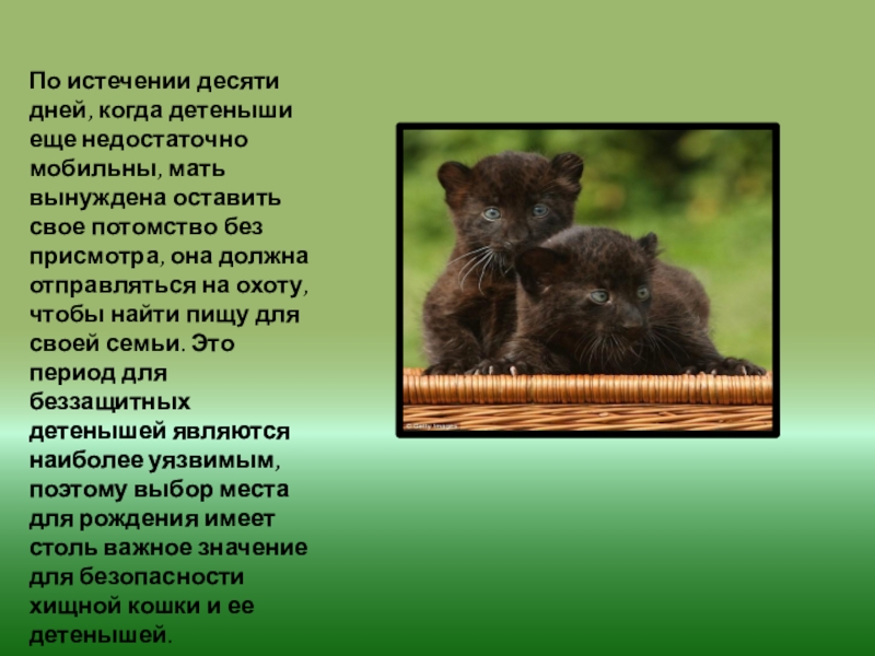 оставить свое потомство без присмотра, она должна отправляться на охоту, чтобы найти пищу для своей семьи. Это период для беззащитных детенышей являются наиболее уязвимым, поэтому выбор места для рождения имеет столь важное значение для безопасности хищной кошки и ее детенышей.