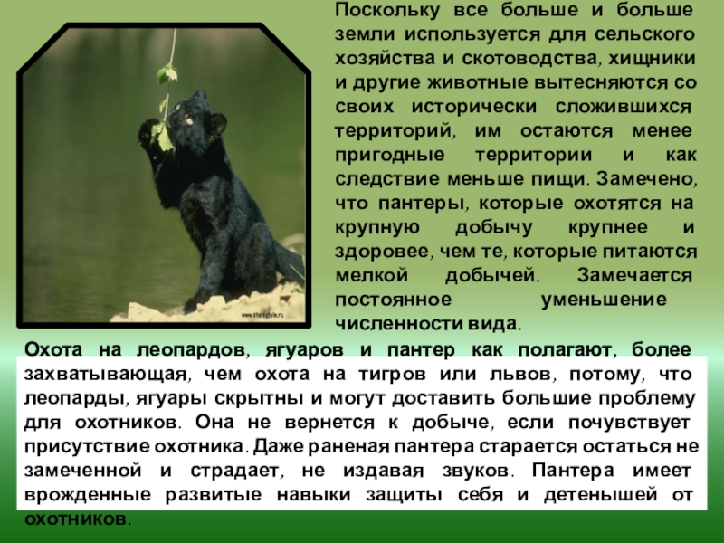 шкурами животных. Шкура черной пантеры редка и очень ценна. Большую угрозу для выживания пантеры является потеря территорий из-за развития сельского хозяйства. Развитие не только уменьшает количество мест обитания доступных пантерам, но и количество пищи, доступной для других диких животных, которые, в свою очередь, являются важными источниками пищи для хищников. Загрязнение окружающей среды, таких как ртуть и другие химические вещества, также является причиной смерти животных. С ростом человеческой популяции, люди двигаются в районах традиционного проживания диких животных. Это особенно верно в Южной и Юго-Восточной Азии, где пантера многочисленна.