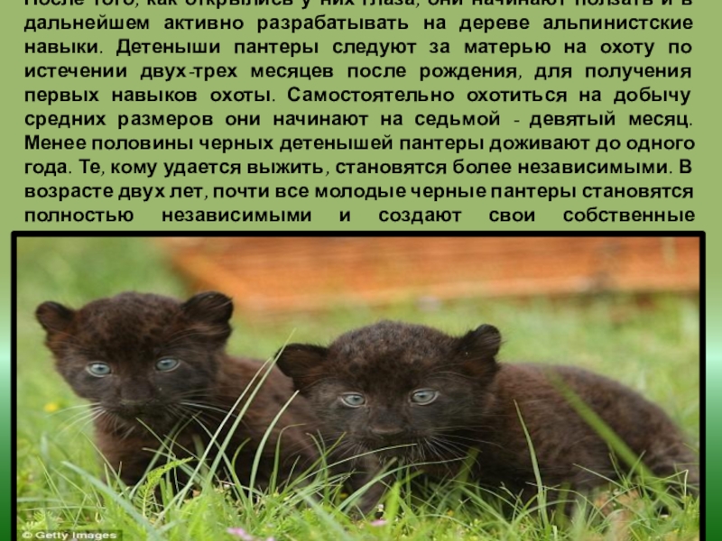 в дальнейшем активно разрабатывать на дереве альпинистские навыки. Детеныши пантеры следуют за матерью на охоту по истечении двух-трех месяцев после рождения, для получения первых навыков охоты. Самостоятельно охотиться на добычу средних размеров они начинают на седьмой - девятый месяц. Менее половины черных детенышей пантеры доживают до одного года. Те, кому удается выжить, становятся более независимыми. В возрасте двух лет, почти все молодые черные пантеры становятся полностью независимыми и создают свои собственные территории для охоты.