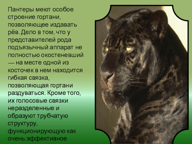 Слайд 3Пантеры меют особое строение гортани, позволяющее издавать рёв. Дело в том,
