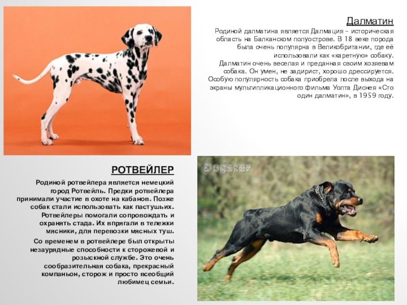 Родиной ротвейлера является немецкий город Ротвейль. Предки ротвейлера принимали участие в охоте на кабанов. Позже собак стали использовать как пастушьих. Ротвейлеры помогали сопровождать и охранять стада. Их впрягали в тележки мясники, для перевозки мясных туш.