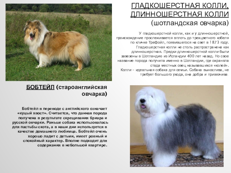 Бобтейл в переводе с английского означает «куцый хвост». Считается, что данная порода получена в результате скрещивания бриара и русской овчарки. Раньше собака использовалась для пастьбы скота, а в наши дни используется в качестве домашнего любимца. Бобтейл очень хорошо ладит с детьми, имеет ровный и спокойный характер. Вполне подходит для содержания в небольшой квартире.