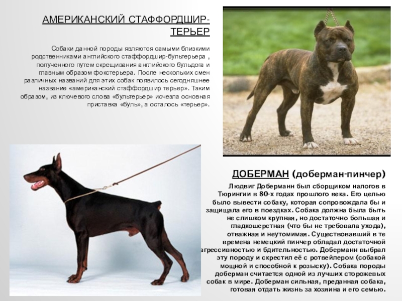 Людвиг Доберманн был сборщиком налогов в Тюрингии в 80-х годах прошлого века. Его целью было вывести собаку, которая сопровождала бы и защищала его в поездках. Собака должна была быть не слишком крупная, но достаточно большая и гладкошерстная (что бы не требовала ухода), отважная и неутомимая. Существовавший в те времена немецкий пинчер обладал достаточной агрессивностью и бдительностью. Доберманн выбрал эту породу и скрестил её с ротвейлером (собакой мощной и способной к розыску). Собака породы доберман считается одной из лучших сторожевых собак в мире. Доберман сильная, преданная собака, готовая отдать жизнь за хозяина и его семью.