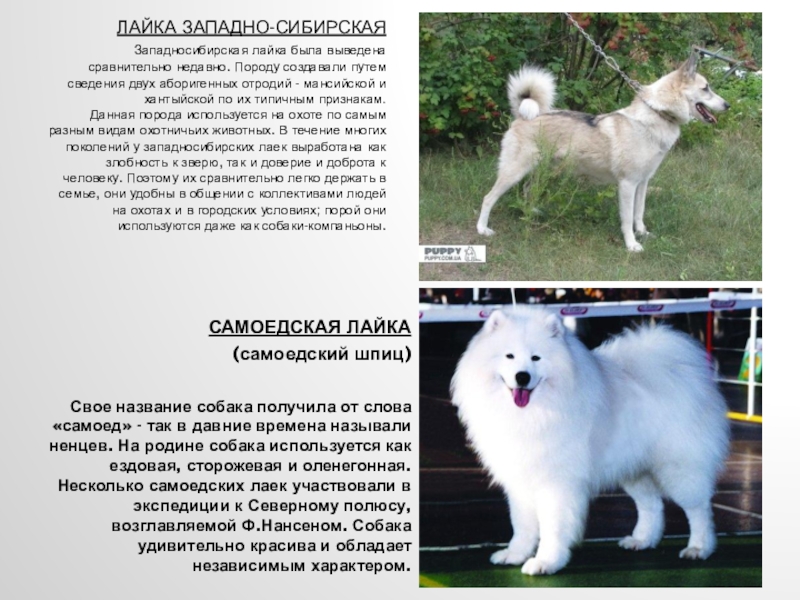 Свое название собака получила от слова «самоед» - так в давние времена называли ненцев. На родине собака используется как ездовая, сторожевая и оленегонная. Несколько самоедских лаек участвовали в экспедиции к Северному полюсу, возглавляемой Ф.Нансеном. Собака удивительно красива и обладает независимым характером.