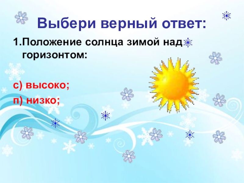 Выбери верный ответ:1.Положение солнца зимой над горизонтом:      	с) высоко;п) низко;