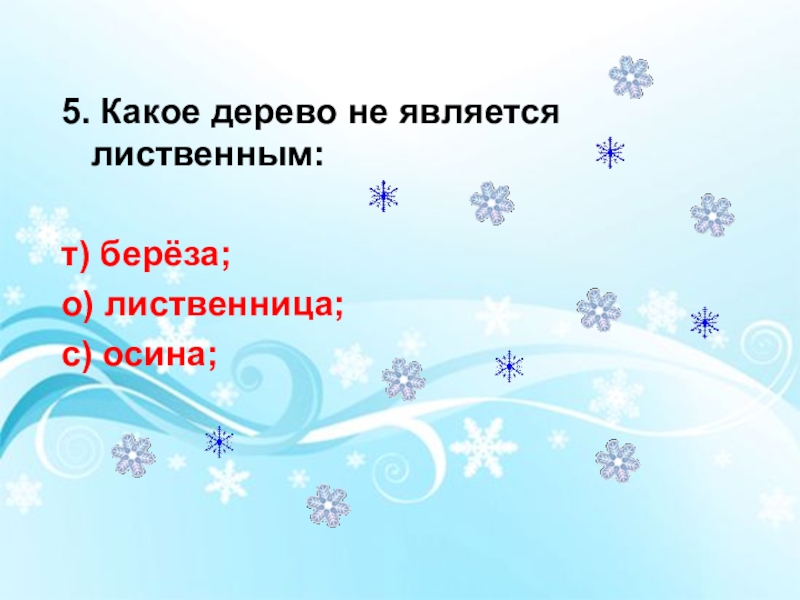 5. Какое дерево не является лиственным:т) берёза;о) лиственница;с) осина;
