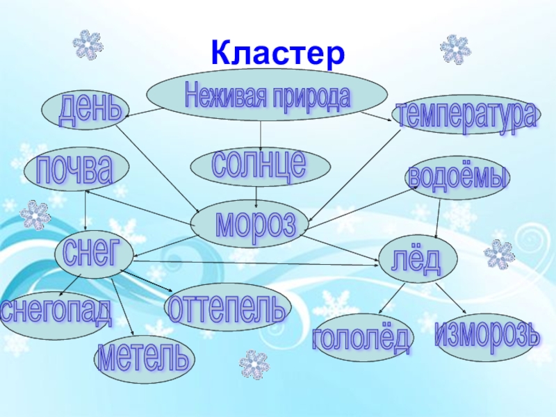 КластерНеживая природаденьсолнцетемператураморозснеглёдснегопадметельоттепельгололёдизморозьпочваводоёмы