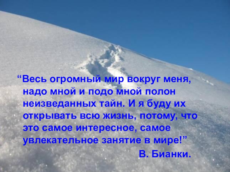 “Весь огромный мир вокруг меня, надо мной и подо мной полон неизведанных тайн. И я буду