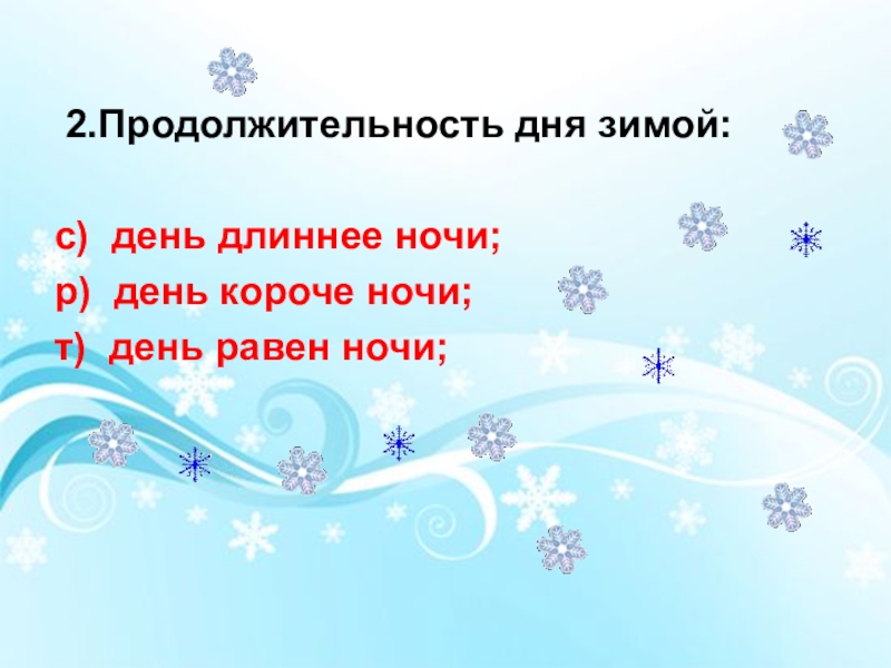 2.Продолжительность дня зимой:с) день длиннее ночи;р) день короче ночи;т) день равен ночи;