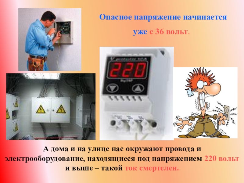 Слайд 11 Опасное напряжение начинается уже с 36 вольт.