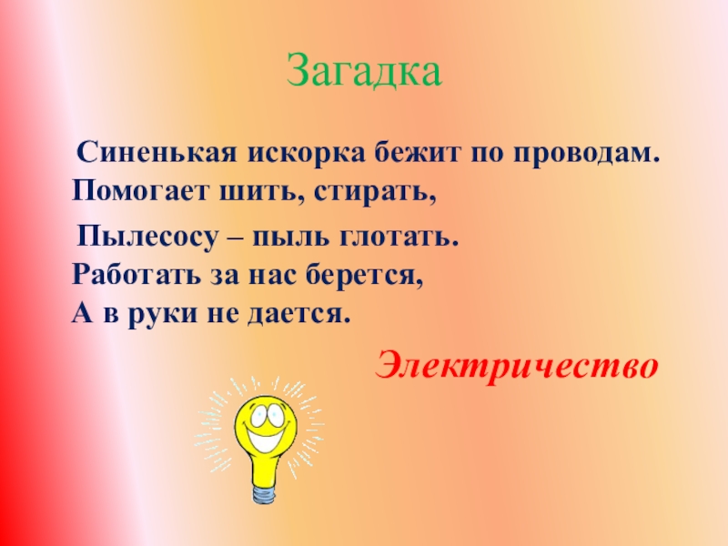 Загадка Синенькая искорка бежит по проводам. Помогает шить, стирать, Пылесосу – пыль глотать. Работать за нас берется, А в руки не дается.