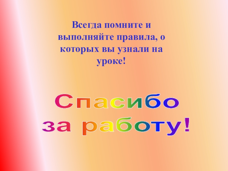 Спасибо за работу!Всегда помните и выполняйте правила, о которых вы узнали на уроке!