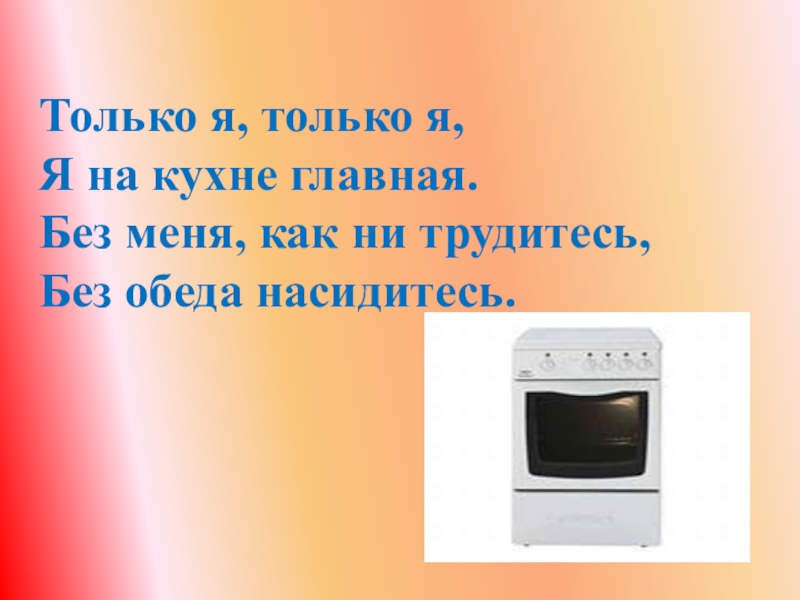 Только я, только я, Я на кухне главная. Без меня, как ни трудитесь, Без обеда