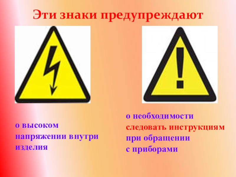 Эти знаки предупреждают  о высоком напряжении внутри изделияо необходимости следовать инструкциям при обращении с приборами