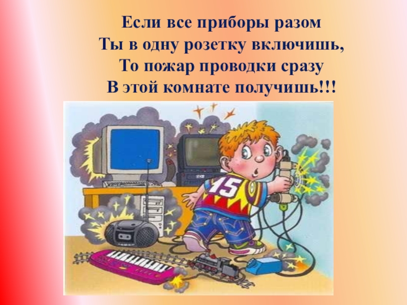Если все приборы разом Ты в одну розетку включишь, То пожар проводки сразу В этой комнате получишь!!!