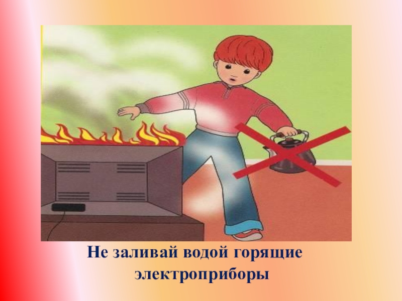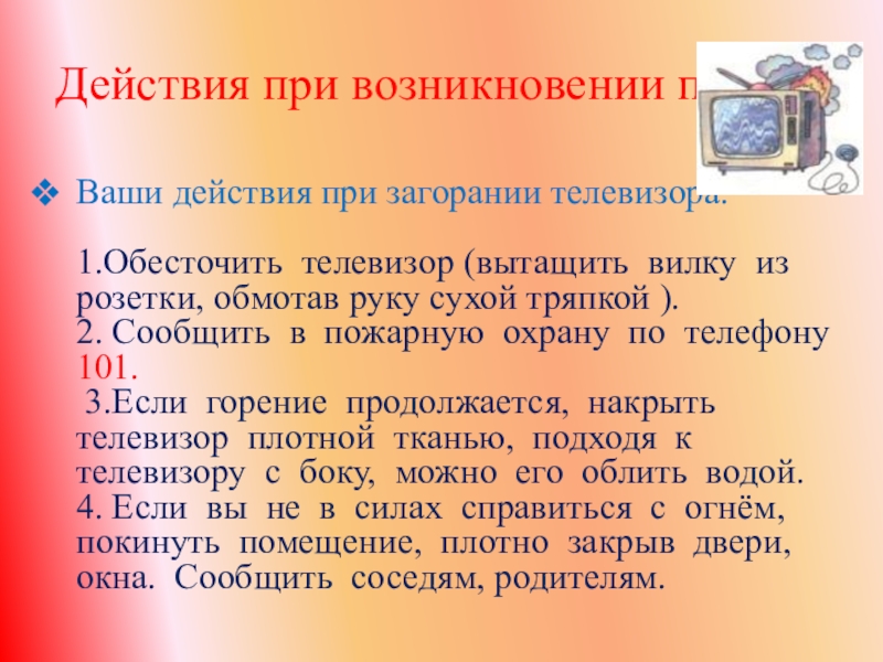 (вытащить вилку из розетки, обмотав руку сухой тряпкой ). 2. Сообщить в пожарную охрану по телефону 101. 3.Если горение продолжается, накрыть телевизор плотной тканью, подходя к телевизору с боку, можно его облить водой. 4. Если вы не в силах справиться с огнём, покинуть помещение, плотно закрыв двери, окна. Сообщить соседям, родителям.