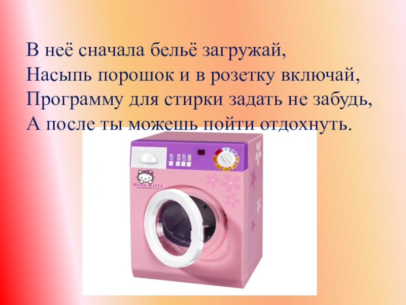 Слайд 7В неё сначала бельё загружай, Насыпь порошок и в розетку включай, Программу для