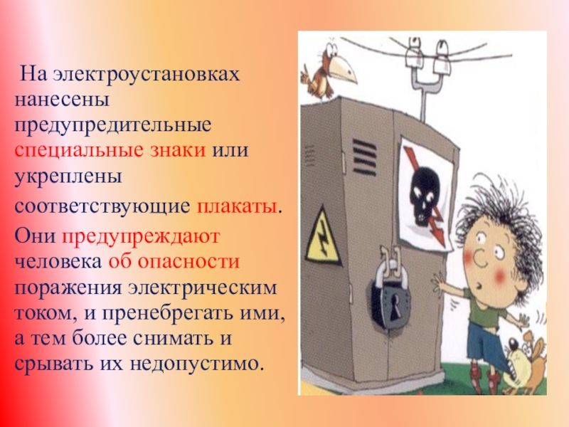 предупреждают человека об опасности поражения электрическим током, и пренебрегать ими, а тем более снимать и срывать их недопустимо.