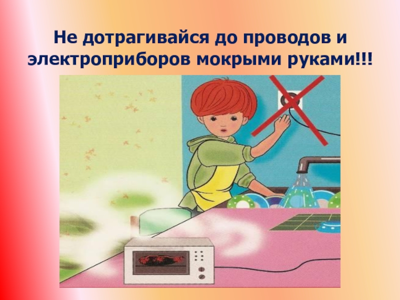 Слайд 15Не дотрагивайся до проводов и электроприборов мокрыми руками!!!