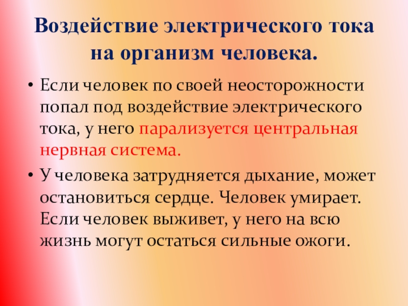 Воздействие электрического тока на организм человека.  Если человек по своей неосторожности попал под воздействие электрического тока,