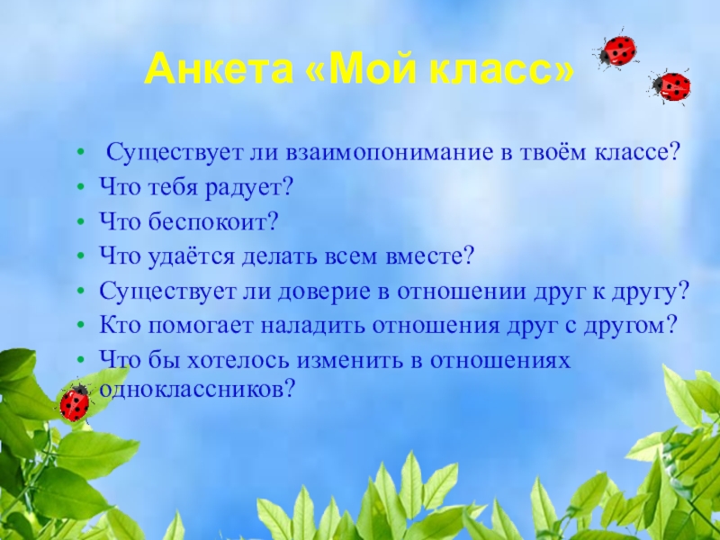 Анкета «Мой класс» Существует ли взаимопонимание в твоём классе? Что тебя радует?Что беспокоит?Что удаётся делать всем вместе?Существует ли доверие в отношении друг к другу?Кто