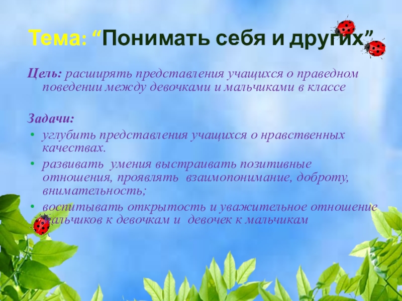 Тема: “Понимать себя и других” Цель: расширять представления учащихся о праведном поведении между девочками и мальчиками в