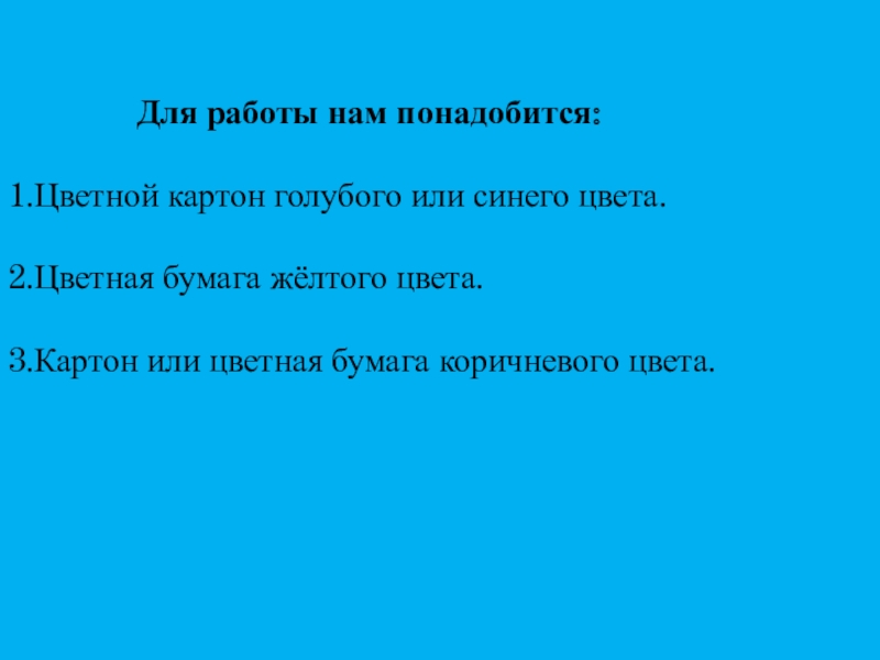 понадобится: 1.Цветной картон голубого или синего цвета. 2.Цветная бумага жёлтого цвета. 3.Картон или цветная бумага коричневого цвета.