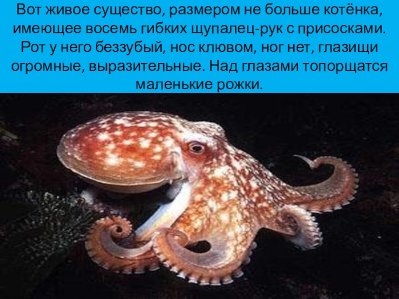 Слайд 9Вот живое существо, размером не больше котёнка, имеющее восемь гибких щупалец-рук