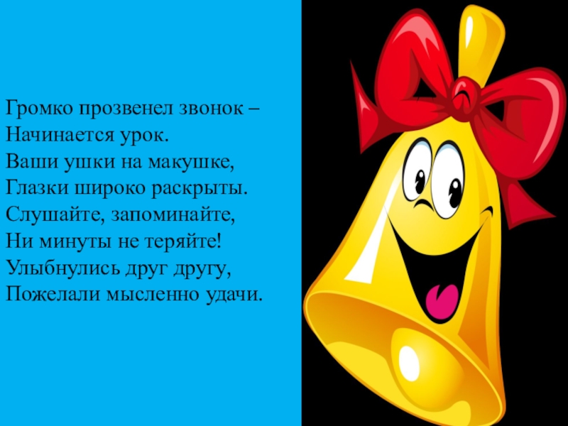 Громко прозвенел звонок –  Начинается урок.  Ваши ушки на макушке,  Глазки широко раскрыты.  Слушайте, запоминайте,  Ни минуты не теряйте! Улыбнулись друг другу,  Пожелали мысленно удачи.