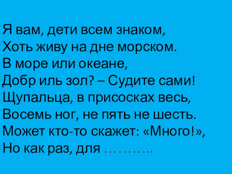 океане, Добр иль зол? – Судите сами! Щупальца, в присосках весь, Восемь ног, не пять не шесть. Может кто-то скажет: «Много!», Но как раз, для ………..