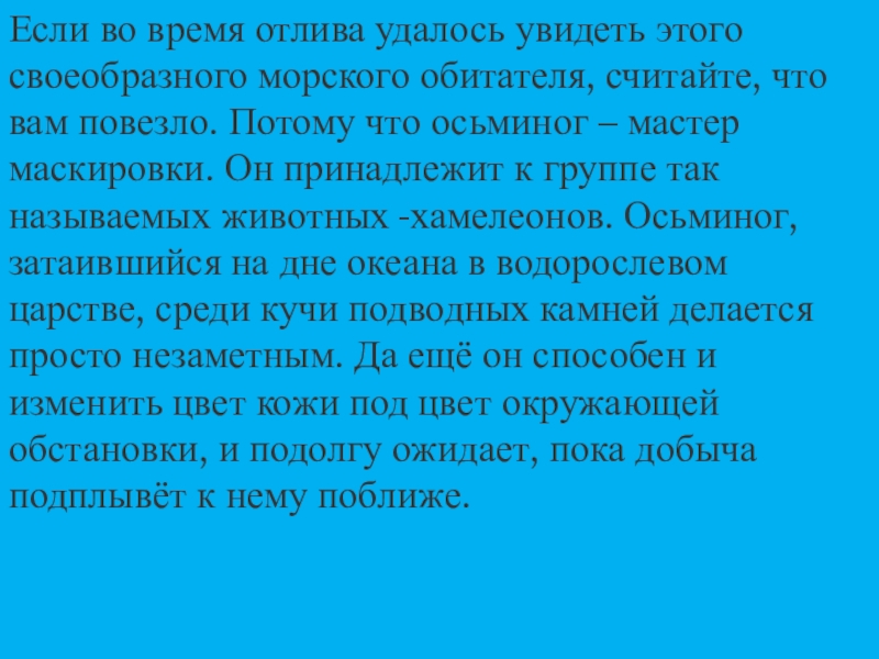 что вам повезло. Потому что осьминог – мастер маскировки. Он принадлежит к группе так называемых животных -хамелеонов. Осьминог, затаившийся на дне океана в водорослевом царстве, среди кучи подводных камней делается просто незаметным. Да ещё он способен и изменить цвет кожи под цвет окружающей обстановки, и подолгу ожидает, пока добыча подплывёт к нему поближе.