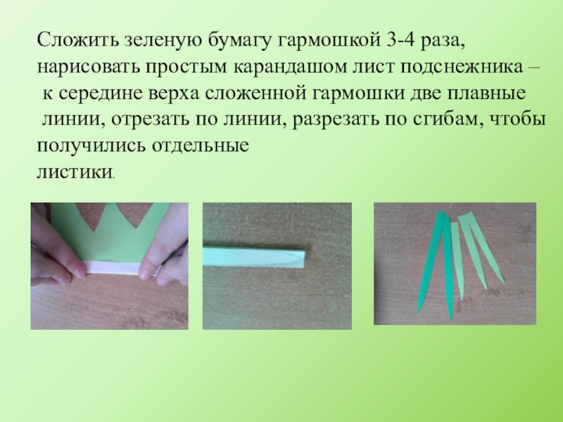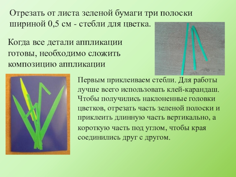 Первым приклеиваем стебли. Для работы лучше всего использовать клей-карандаш. Чтобы получились наклоненные головки цветков, отрезать часть зеленой полоски и приклеить длинную часть вертикально, а