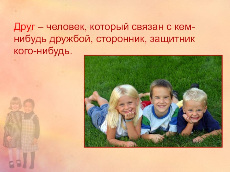 Слайд 10Друг – человек, который связан с кем-нибудь дружбой, сторонник, защитник кого-нибудь.