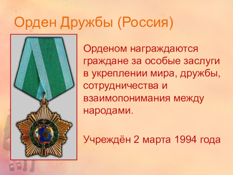 Орденом награждаются граждане за особые заслуги в укреплении мира,
